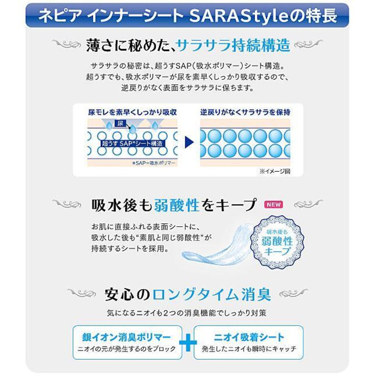 超うすでも、続くサラサラのインナーシートSARAStyleに、 吸水後も弱酸性が続く表面シートを採用。