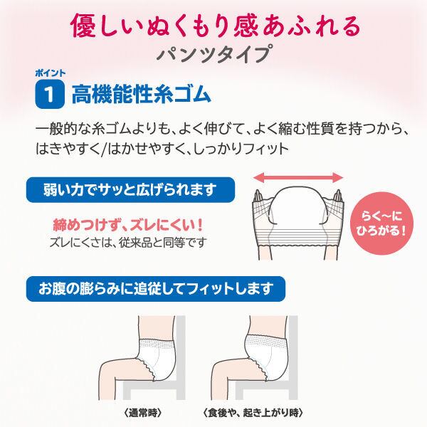 ・糸ゴムの間隔が広い「幅広レグギャザー」が脚まわりを優しく包みながら、そけい部の隙間を防ぎ、モレにくくします。