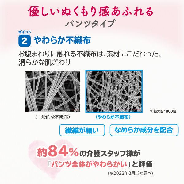 ・「やわらか不織布」を全体に使用し、「高機能性糸ゴム」との組み合わせで、優しいぬくもり感があります。
