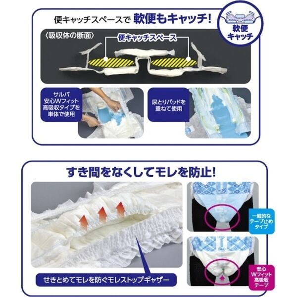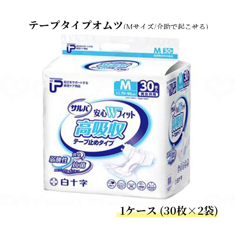 商品番号:929267m テープタイプオムツ 高吸収テープ PUサルバ安心Wワィット Mサイズ 1ケース (30枚x2袋) 白十字 高吸収テープ サルバ 高吸収テープ止め 男女共用 介護用オムツ 失禁 尿ケア 尿もれ 介助で起こせる