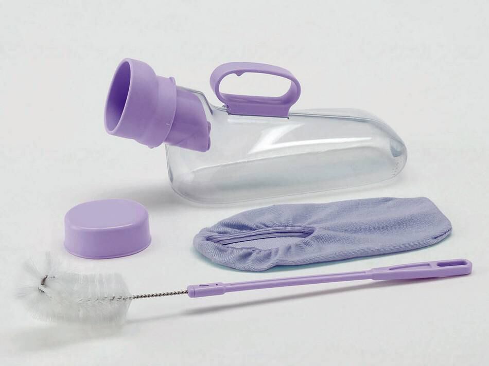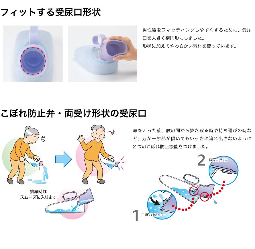 ・こぼれ防止弁・両受け形状の受尿口尿をとった後、股の間から抜き取る時や持ち運びの時など、万が一尿器が傾いても一気に流れ出さないように2つのこぼれ防止機能をつけました。(こぼれ防止弁、両受け形状)