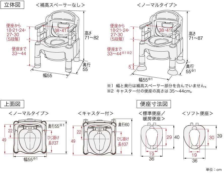 ※補高スペーサーなしは、幅55×奥行55×高さ71〜82cm(便座までの高さ:33〜44cm)