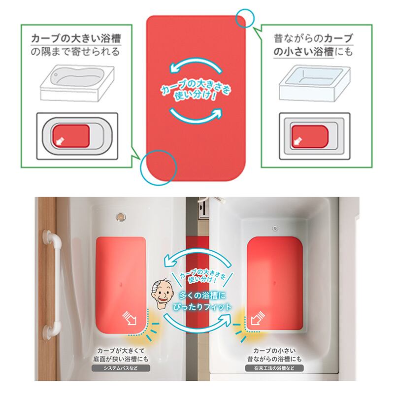 ・カーブが大きく底面が狭い浴槽にも、カーブの小さい昔ながらの浴槽にも隅までぴったりフィットして設置できるすべり止めマット。