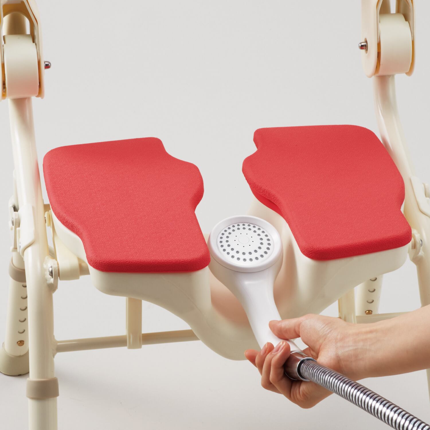 ・座ったままお尻が洗える、U字溝座面のシャワーベンチ。介助する人の負担を軽減します。