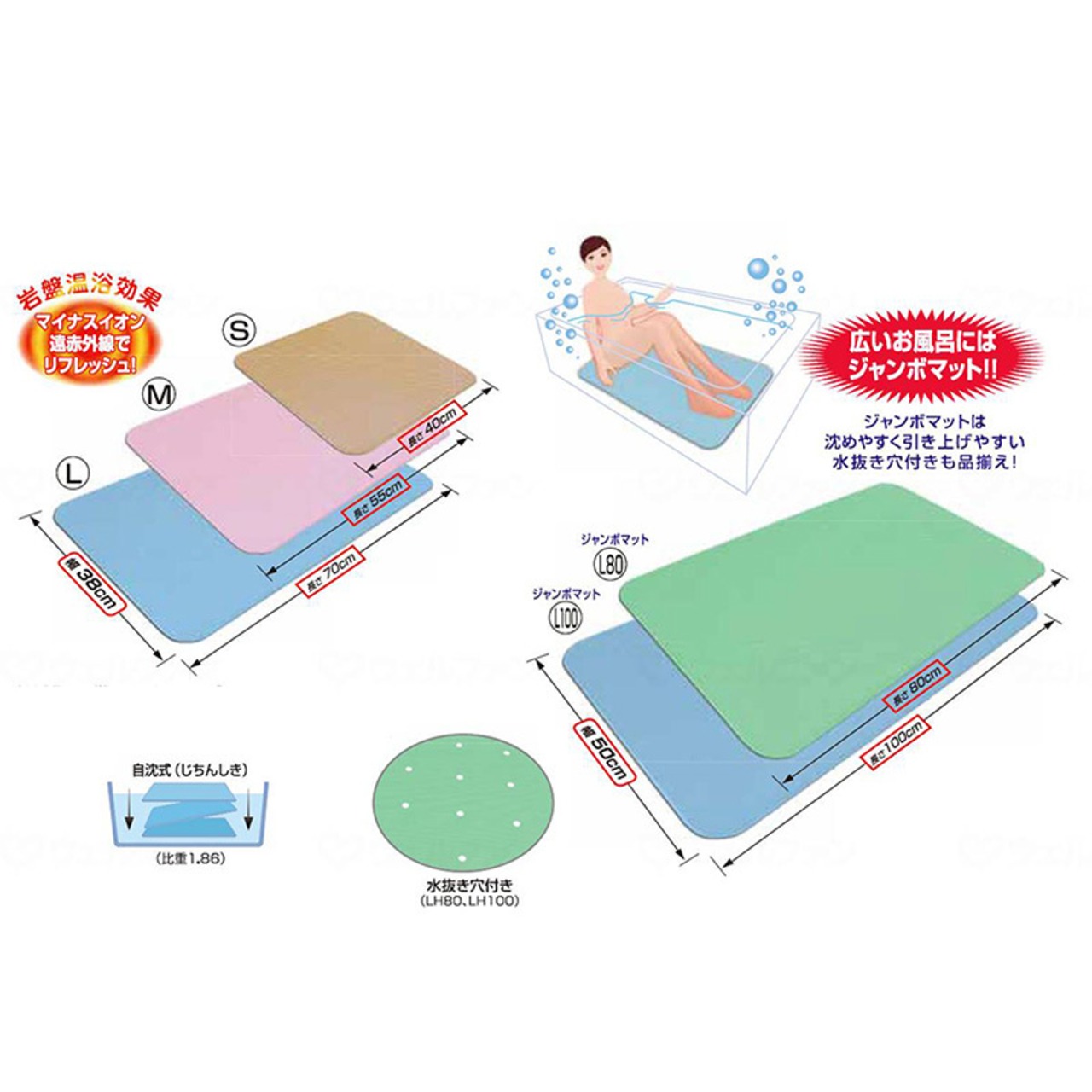 ・古くなって浴槽底部がザラついたり、元々浴槽底部に凹凸のある浴槽では吸着式のマットの吸盤が付着しない浴槽も多くありますが、浴槽にお湯を張る前でも後でも、単に底に沈めるだけ(自沈式)でどなたにも安心してご使用できます。